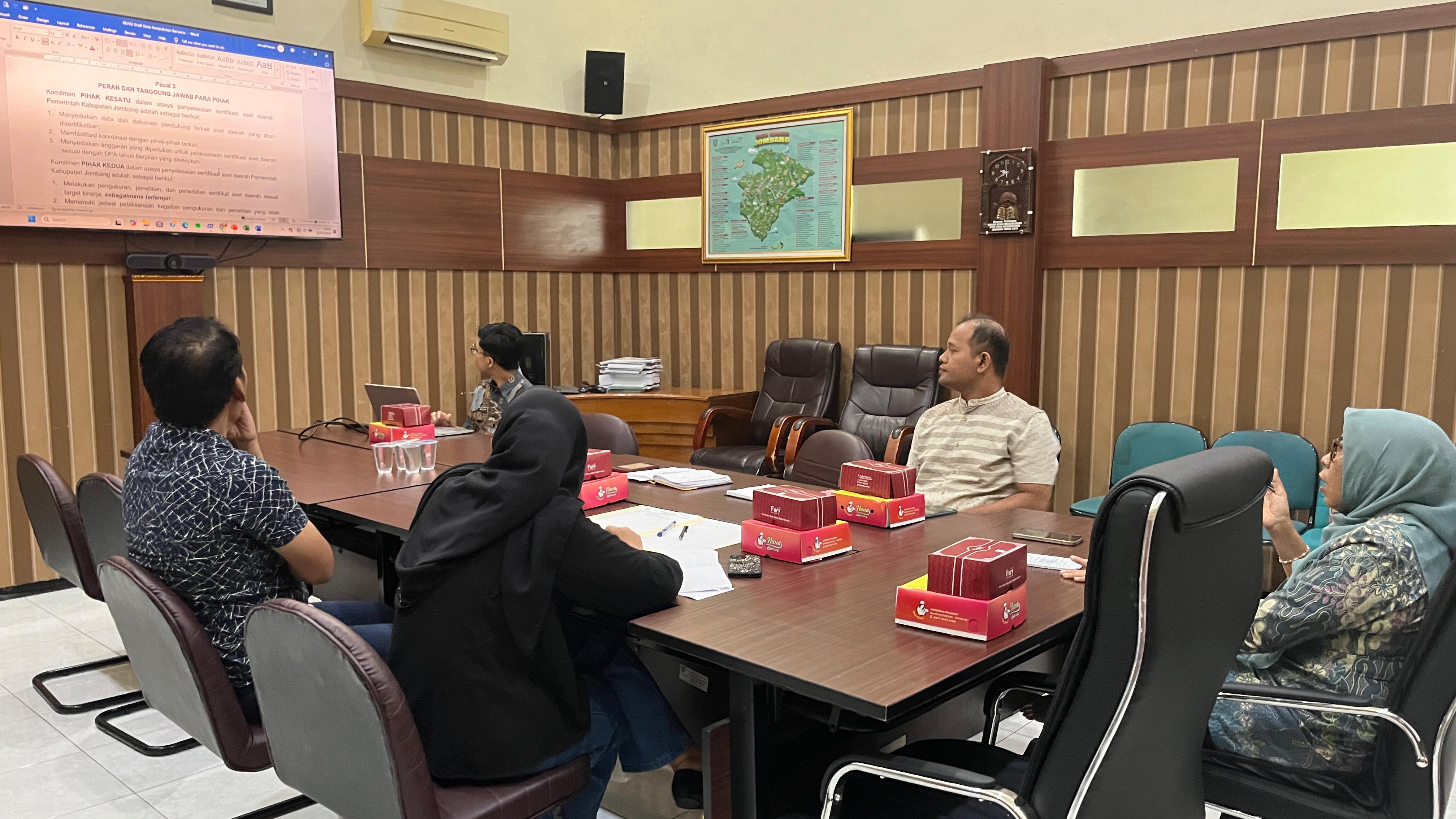 Rapat ini membahas terkait gambaran umum aset tanah kabupaten jombang tahun 2025, skala prioritas dan target pensertifikatan, serta rencana aksi yang harus ditempuh oleh BPKAD bersama Kantor Pertanahan Jombang. Melalui rapat ini, diharapkan terjalin komitmen bersama antara Pemerintah Kabupaten Jombang dengan Kantor Pertanahan Kabupaten Jombang dalam upaya penyelesaian sertifikasi aset daerah Kabupaten Jombang tahun 2025.